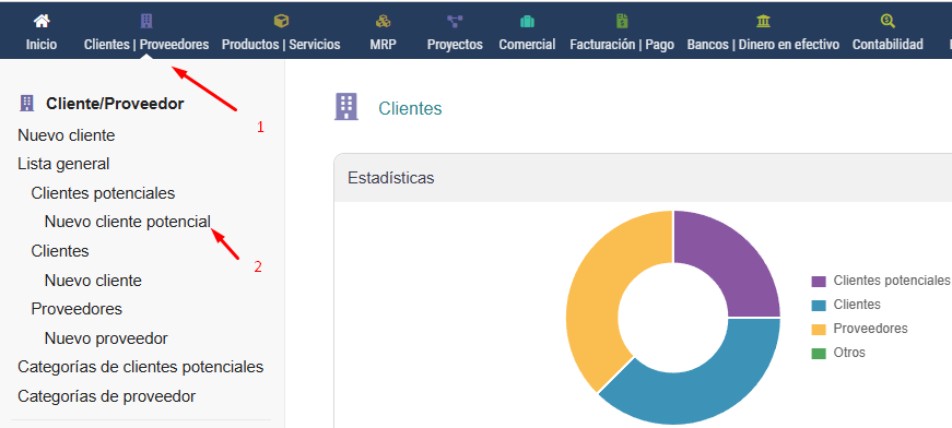 En el menú superior de clic en «Clientes / Proveedores» en el menú que aparece ala izquierda tome la opción «Nuevo cliente potencial»