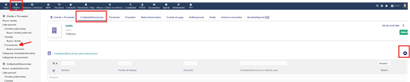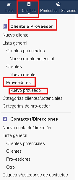 En el ERP existe 2 menús, el superior (Clientes ) y lateral (Cliente o Proveedor y Contactos/Direcciones). Primero seleccionaremos en la barra superior y después se desplegará la barra lateral. Por ejemplo