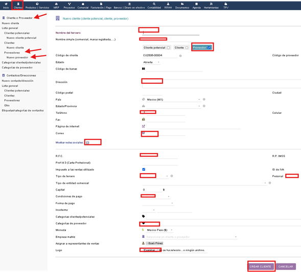 Ruta: clientes/ clientes o proveedores / proveedores
