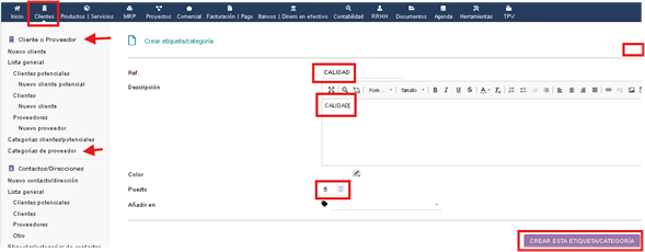Ruta: Clientes /Cliente o proveedor / Categorías de proveedor / +