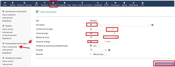 En esta sección vamos a crear nuestro borrador de nuestro nuevo presupuesto, a llenando los campos que nos indique el formulario, esto para documentarlo.